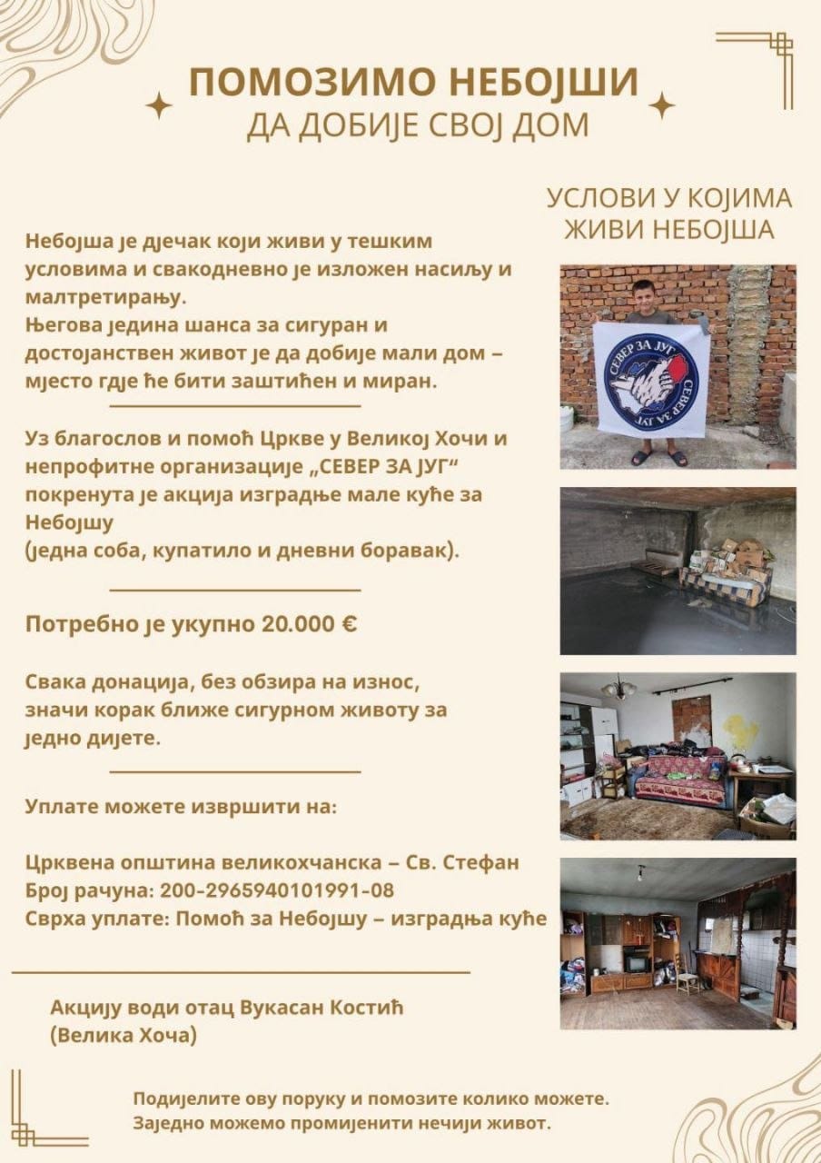 ПОКРЕНУТА ХУМАНИТАРНА АКЦИЈА ЗА ИЗГРАДЊУ ДОМА НЕБОЈШИ ИЗ ВЕЛИКЕ ХОЧЕ На овај рачун можете уплатити средства